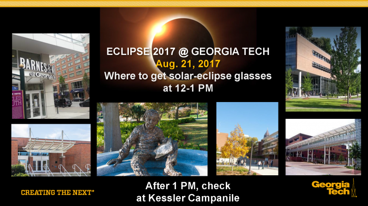 In exactly one week, the great American eclipse of Aug. 21, 2017, will sweep across the U.S. The Georgia Tech campus has geared up for a safe and enjoyable eclipse experience, beginning with the distribution of solar-eclipse glasses.