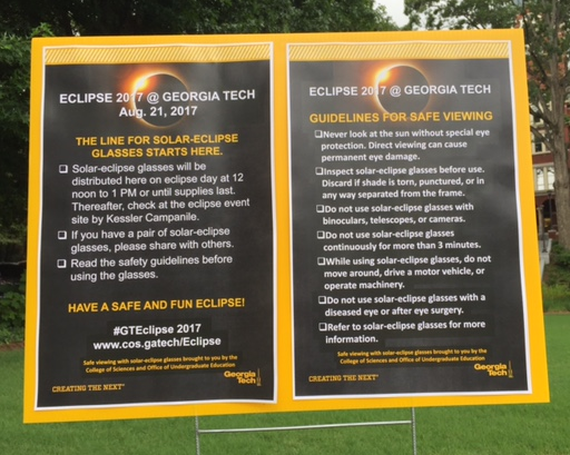 For this reason, the College of Sciences and the Office of Undergraduate Education have teamed up to make available solar-eclipse glasses to the Georgia Tech community. We have plenty, but if not enough, we highly encourage sharing so everyone can view the solar sensation safely.