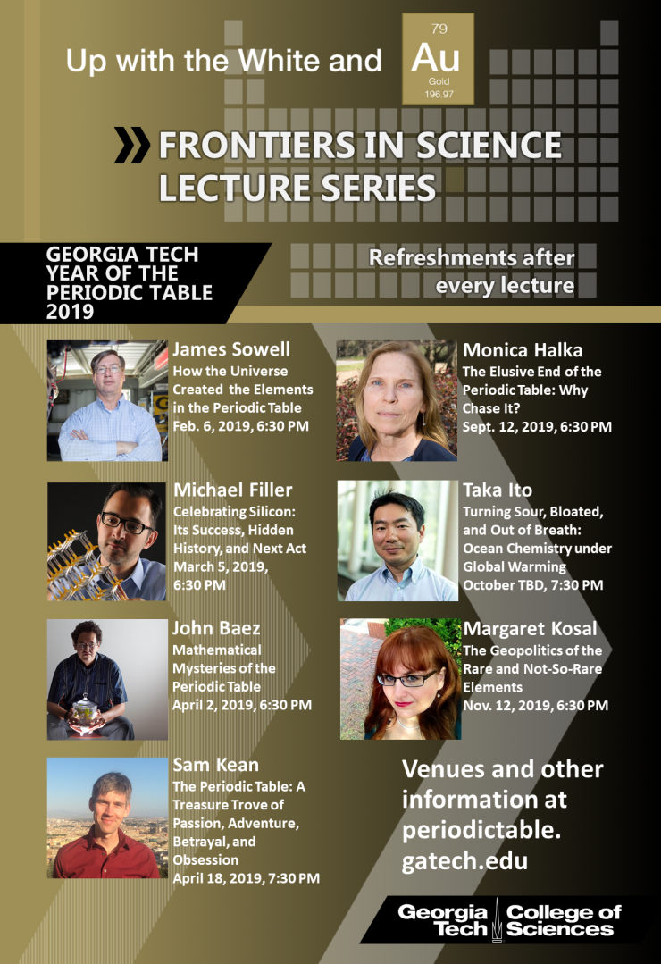 Throughout 2019, the College of Sciences will bring prominent researchers from Georgia Tech and beyond to expound on little-discussed aspects of chemical elements: