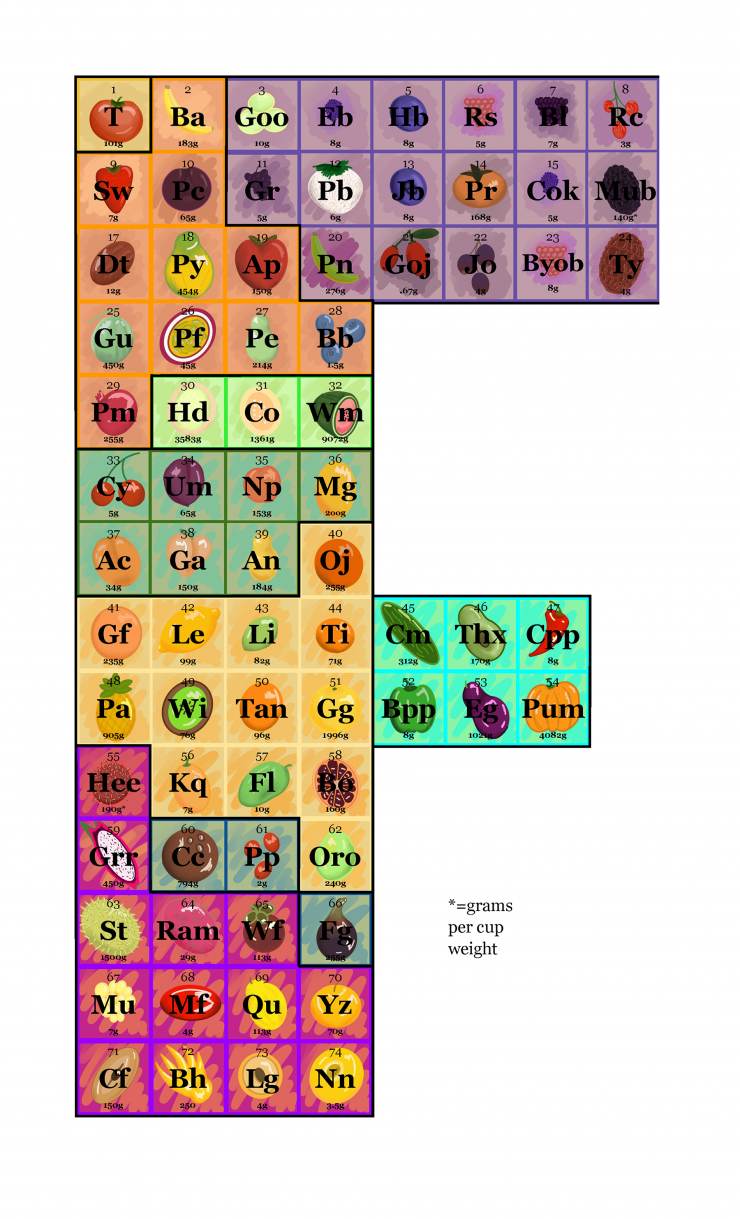 Asia and Diana also considered trends among their elements, organizing fruits in order of acidity, nutritional value, and popularity. “It’s amazing how perfect the periodic table is, and how almost everything is in ascending order,” Diana says. “Having to study the elements has helped me realize that the periodic table deserves more recognition and praise for how cool and perfect it is in its organization of trends and patterns.”